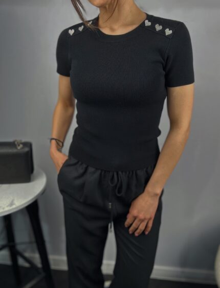 12.00 € / 23.47 лв.Дамска черна блуза с къс ръкав и декоративни сърца