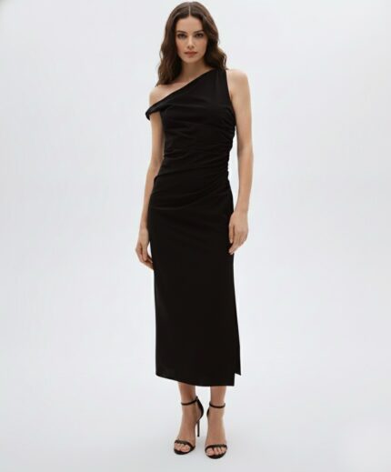33.23 € / 64.99 лв.Дълга черна асиметрична рокля с открито рамо и вталена кройка