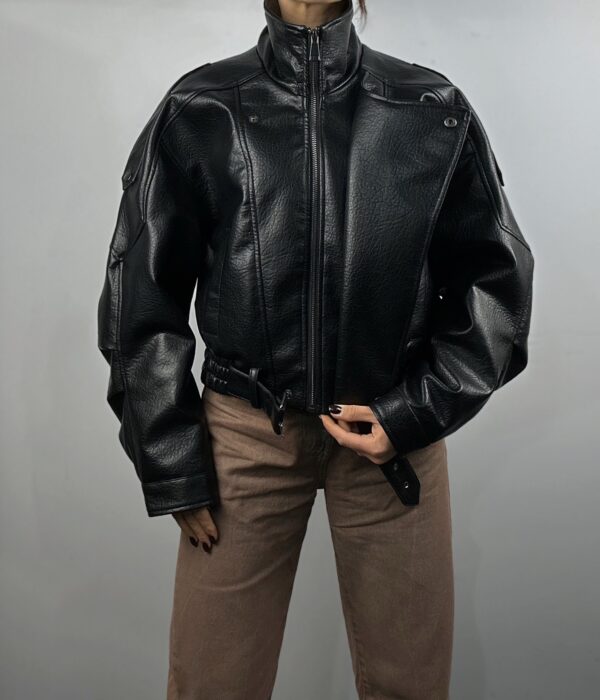 77.00 € / 150.60 лв.Дамско черно кожено яке -модерно късо biker яке с колан