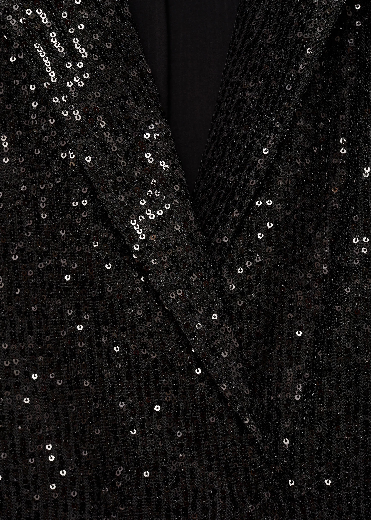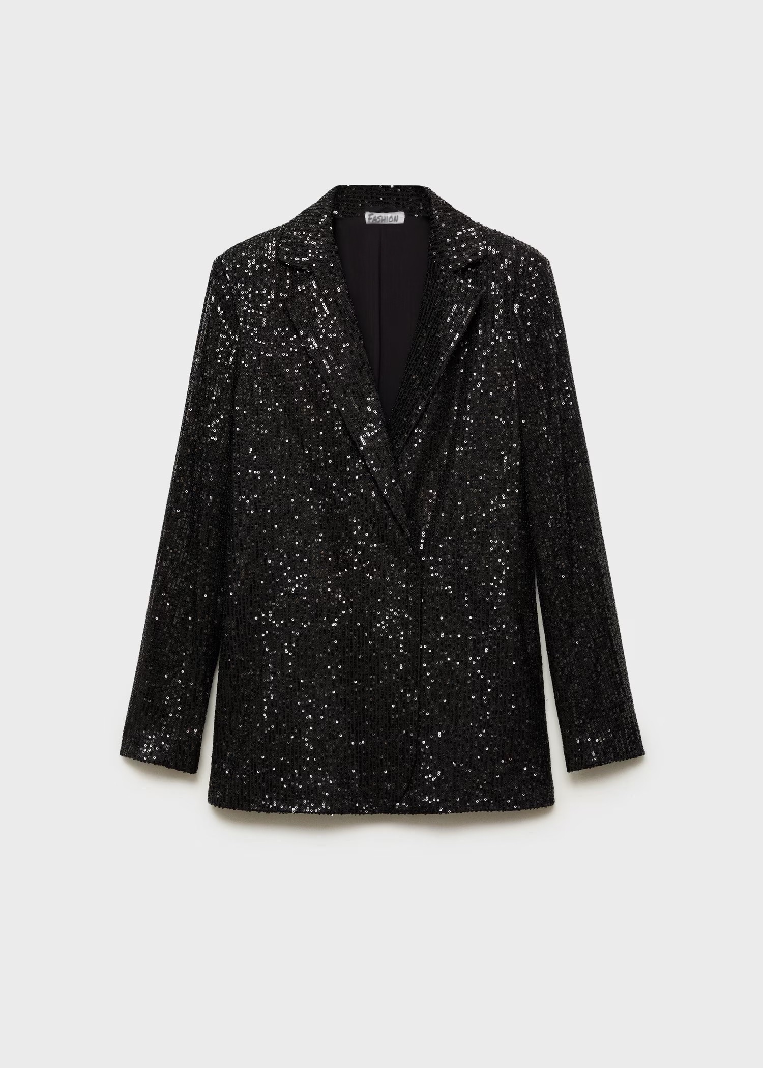 Дамско черно сако с пайети – елегантен блейзър, създаден за специални поводи и вечерни визии. Моделът впечатлява с изцяло покрит дизайн от фини блестящи пайети, които придават луксозен и модеререн акцент. Правата кройка и класическите ревери осигуряват комфорт и универсална линия, подходяща за всякакъв силует. Перфектен избор за празнични събития, официални излизания, клубни вечери или стилни комбинации с топ, панталон или рокля. Идеален за жени, които искат да добавят блясък и класа към гардероба си.