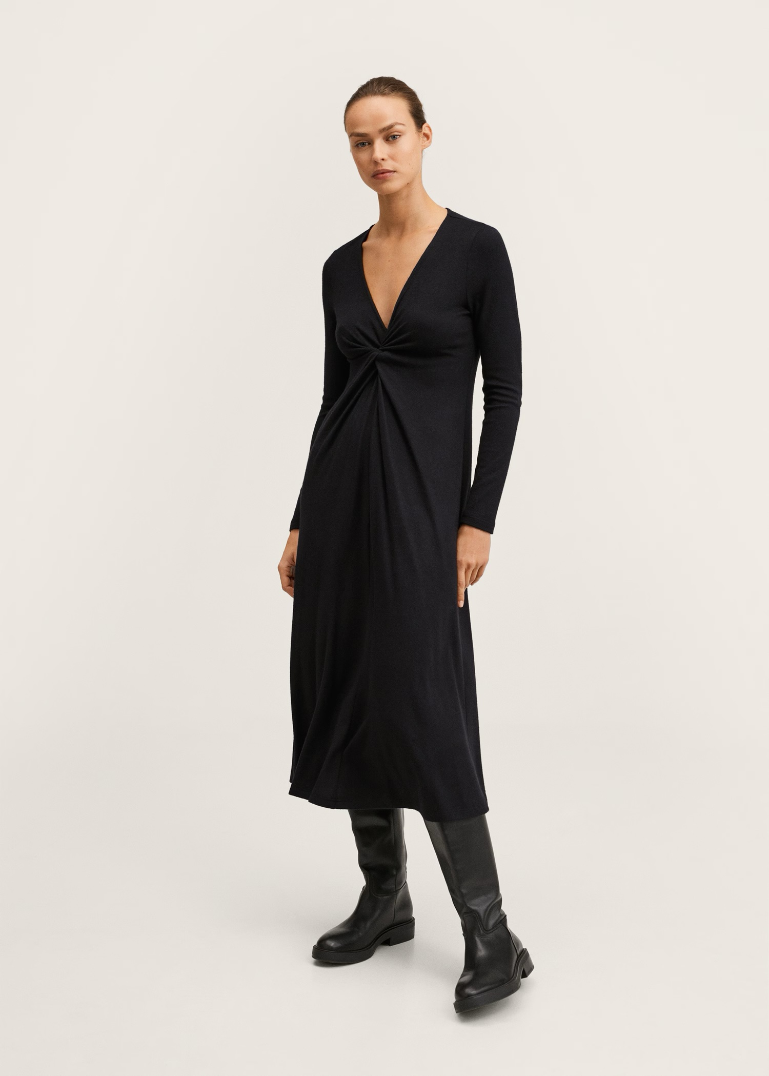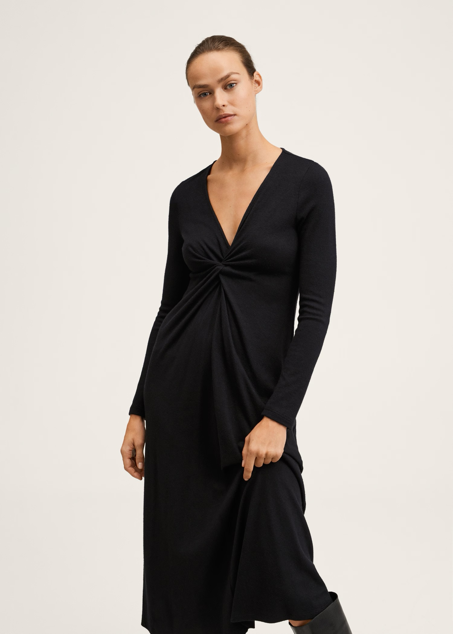 Моделът е без подплата и без закопчаване, което създава леко и естествено падане на плата. V-образното деколте с декоративен възел добавя женствен акцент, а дългите ръкави правят дрехата подходяща както за ежедневието, така и за по-елегантни поводи.