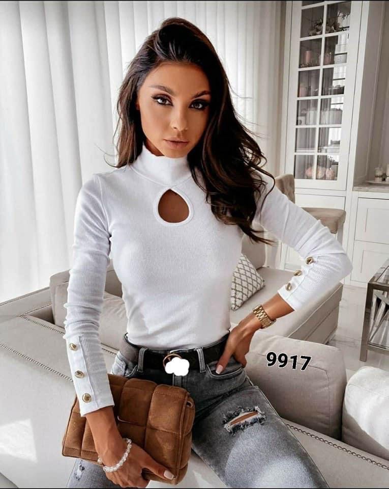 Блузата е с прилепнал силует, който красиво оформя фигурата, без да ограничава движенията. Материята е мека, еластична и приятна на допир, осигуряваща комфорт през целия ден. Дизайнът с изрязан участък подчертава деколтето и придава модерно, женствено излъчване.