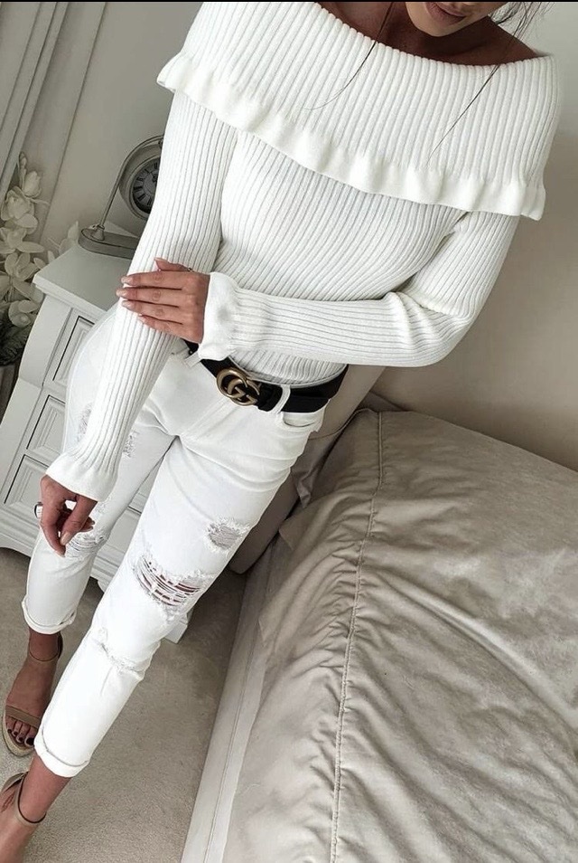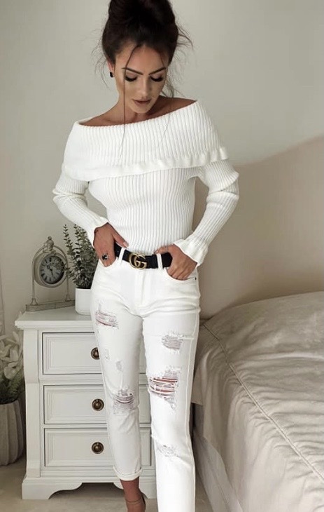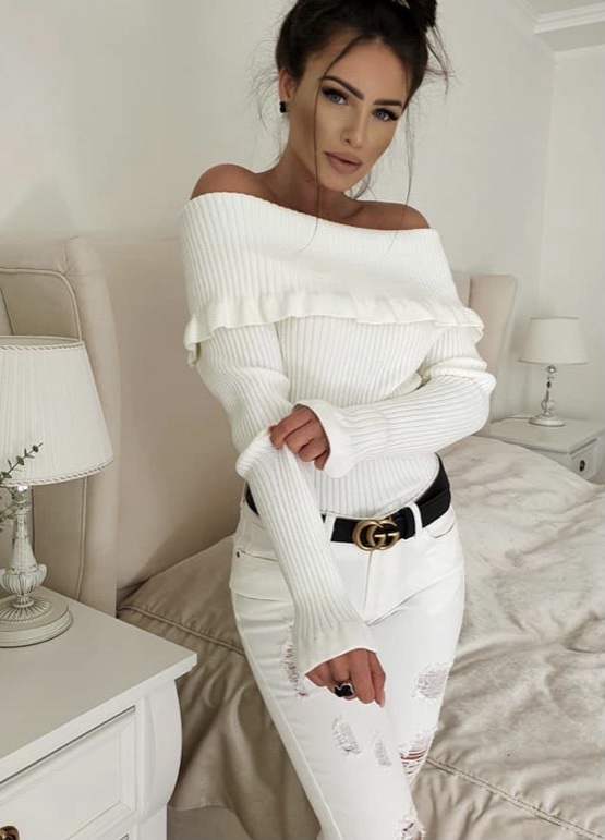 Елегантна и женствена блуза с открити рамене, създадена да подчертае силуета и да придаде стилна визия както в ежедневието, така и при по-специални поводи. Моделът впечатлява с фино рипсено плетиво и нежни декоративни къдри в горната част и при ръкавите, които добавят романтичен и изискан акцент.