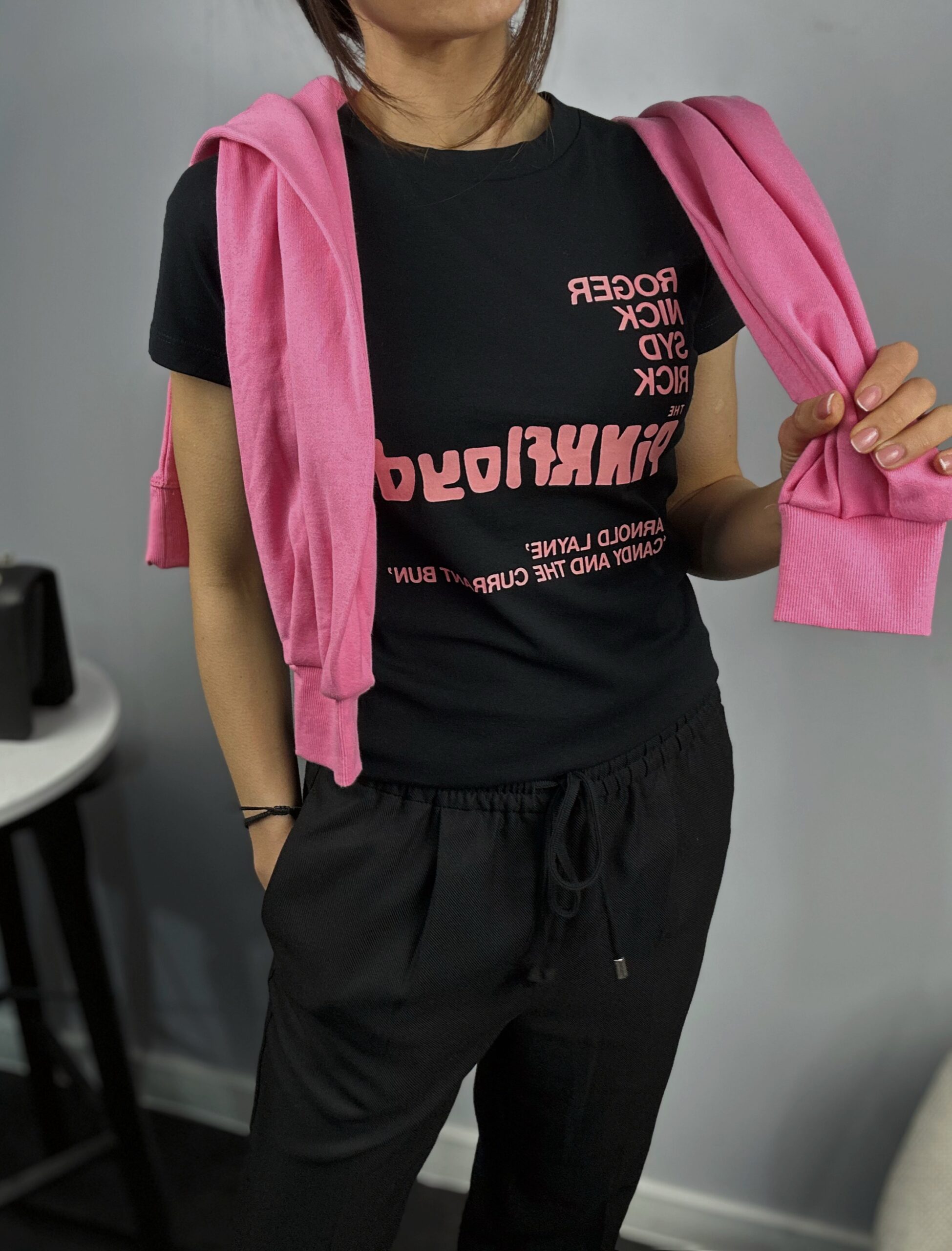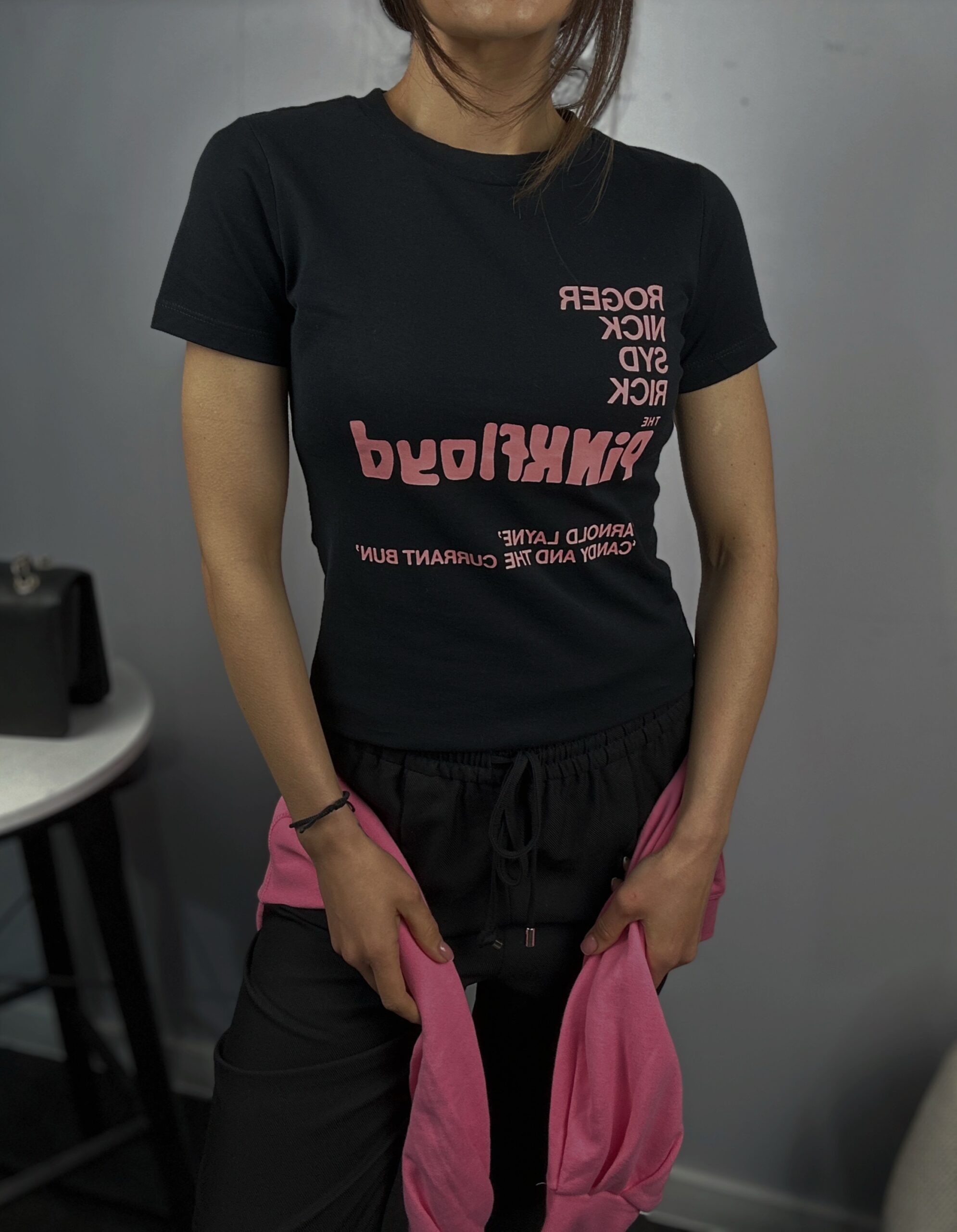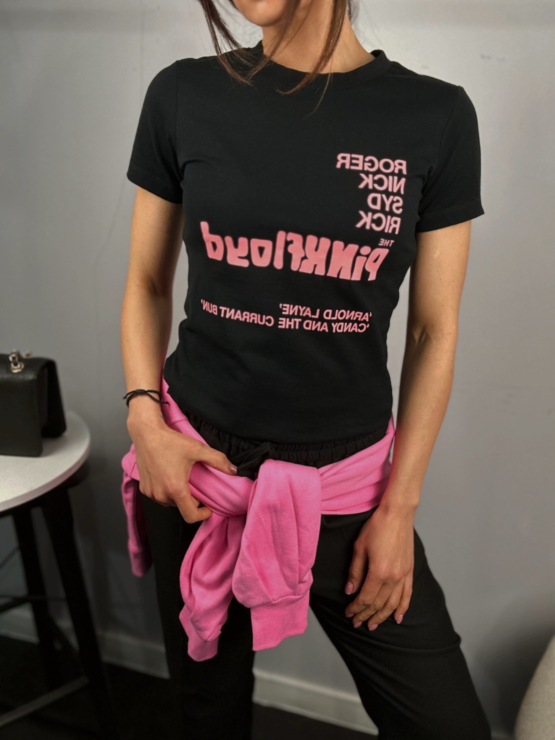 Дамска черна тениска с акцент розов надпис , която придава свежест и индивидуалност. Черната основа създава контраст и прави принта още по-впечатляващ.