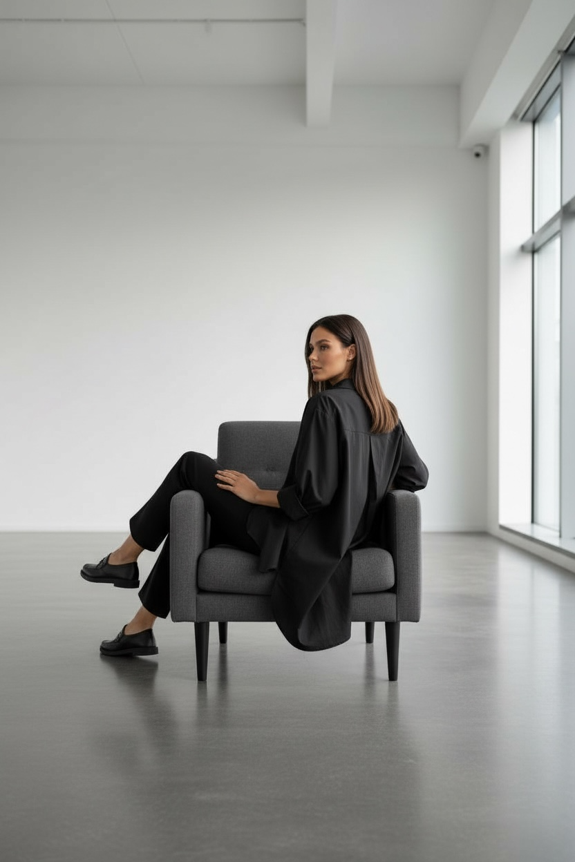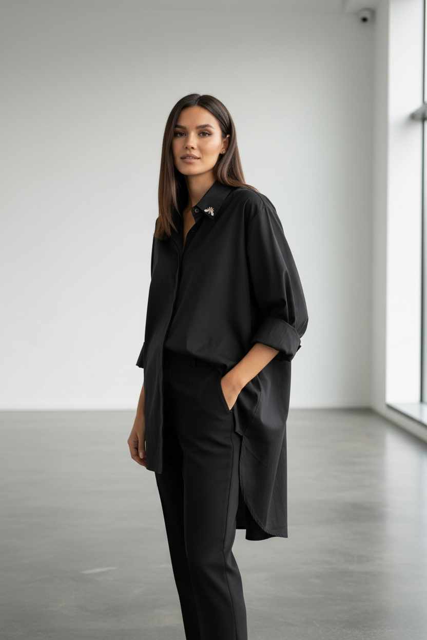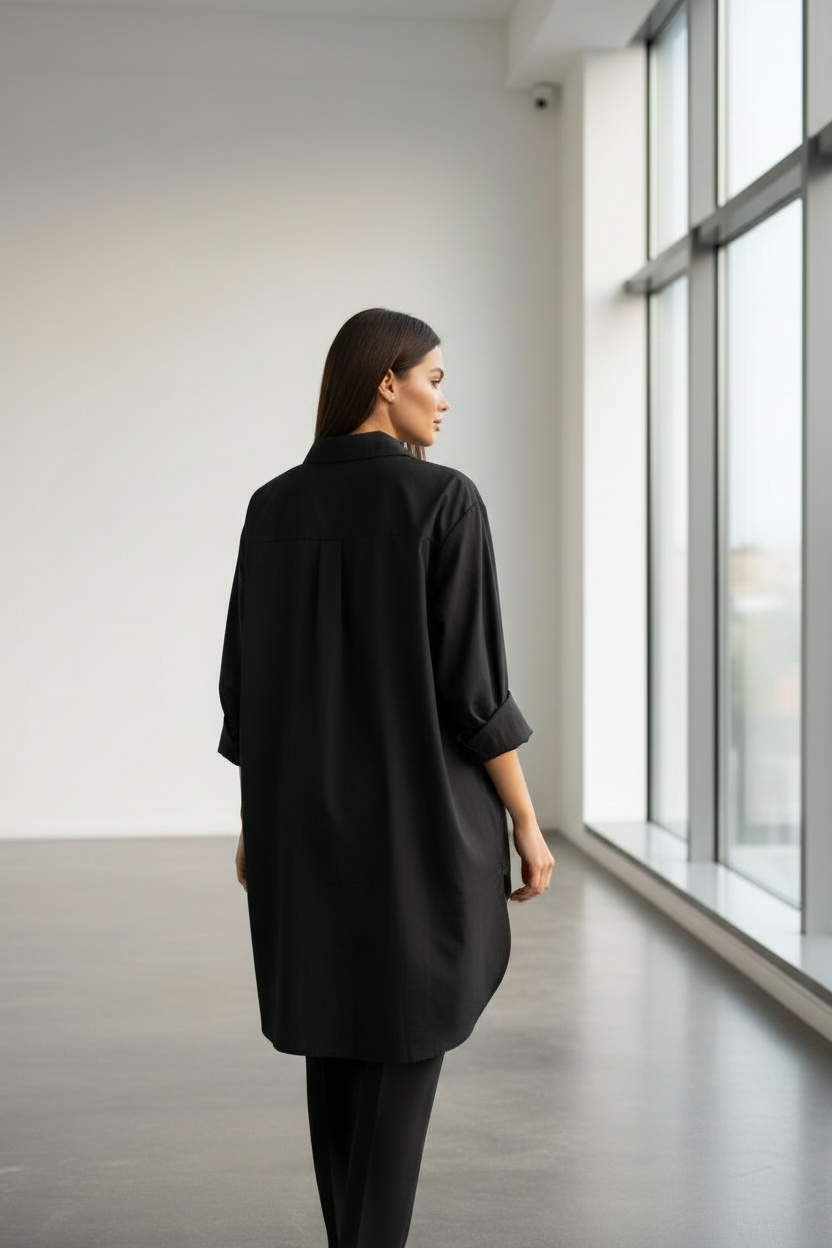 Тази дамска черна риза тип туника е стилно и практично решение за жени, които търсят модерна дамска риза с удължена кройка. Моделът е със свободна, асиметрична линия и дълъг ръкав, което я прави подходяща както за ежедневни визии, така и за офис облекло.