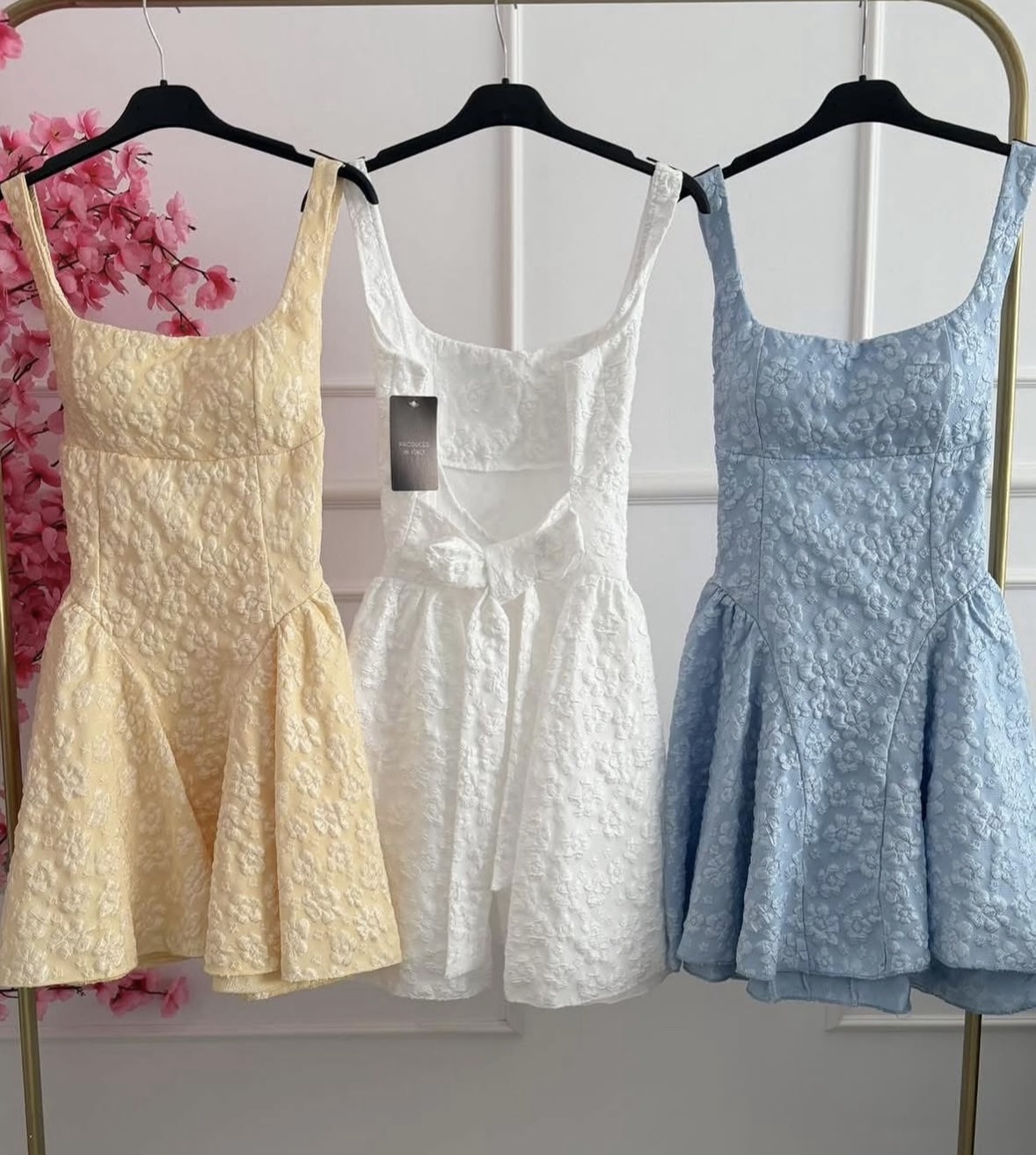 Елегантна дамска рокля в свеж син цвят с релефна текстура и разкроена пола. Моделът подчертава талията и създава изключително женствен силует, подходящ както за ежедневни, така и за по-специални поводи.