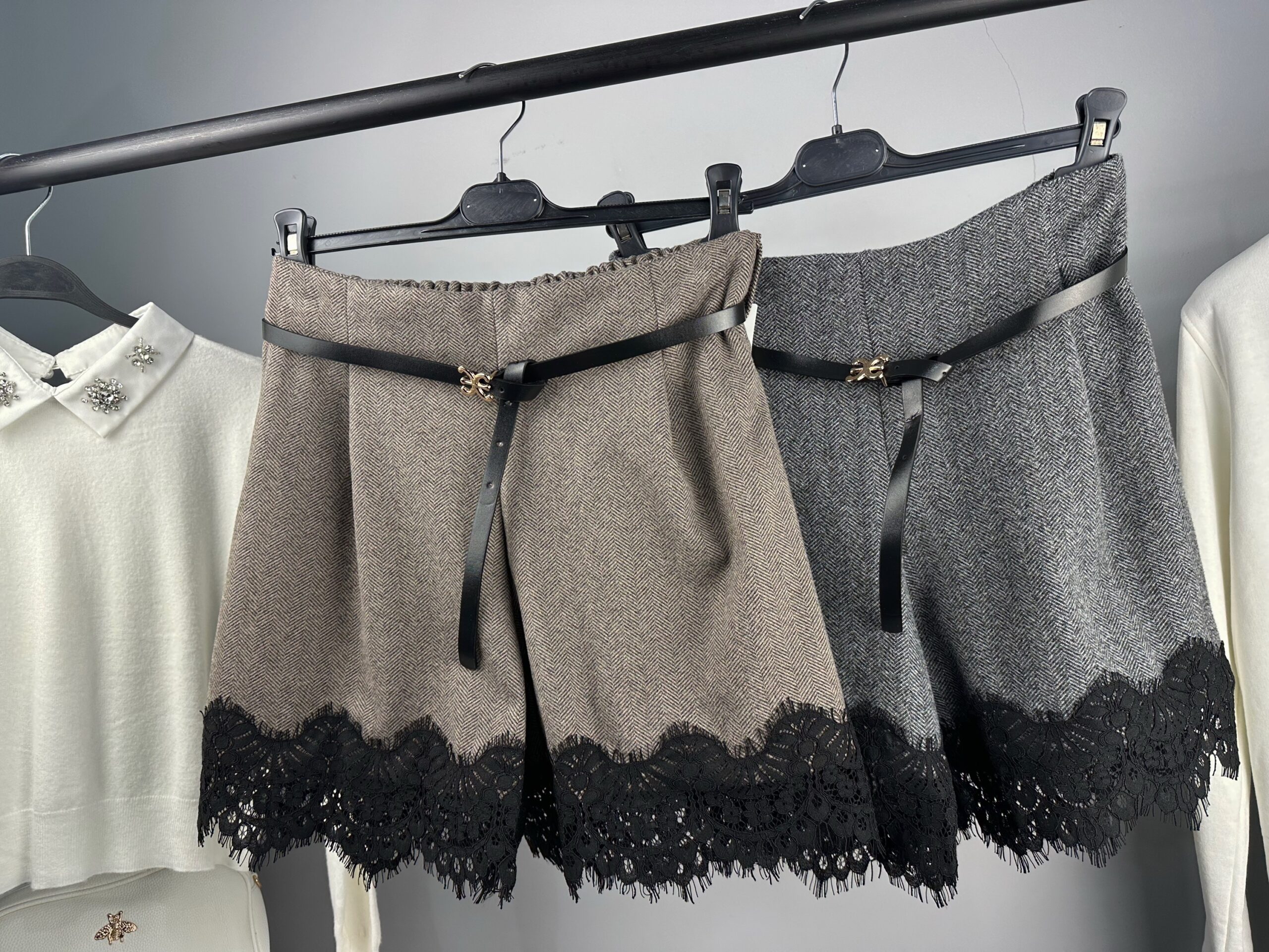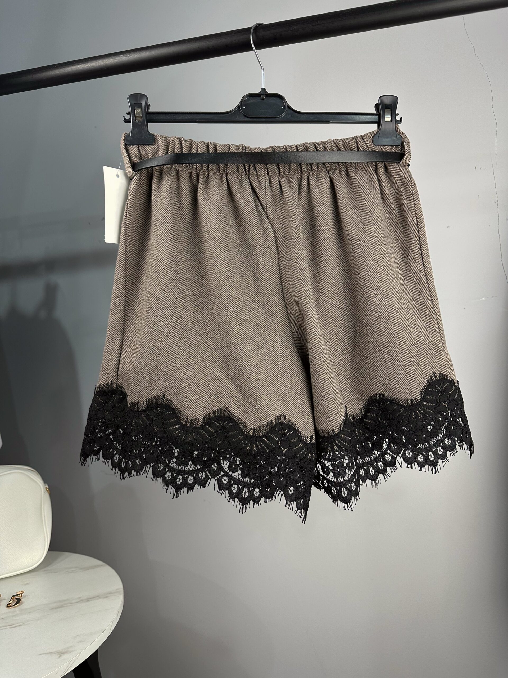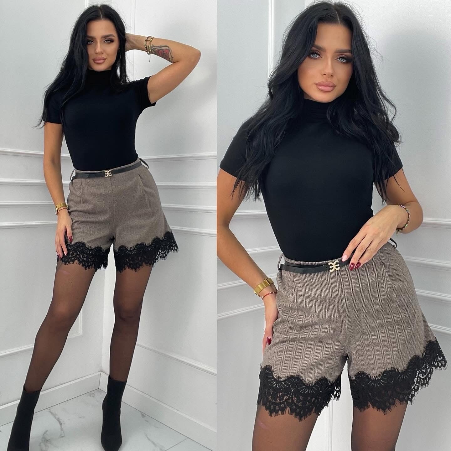 Тези дамски панталони тип шорти с висока талия съчетават изтънчен дизайн и комфорт, превръщайки се в перфектния избор за модерната жена. Моделът е в стилен неутрален цвят и е акцентиран с черна декоративна дантела по крачолите — детайл, който добавя елегантност и подчертава силуета. Подходящи са за ежедневни, офис и вечерни визии, като се комбинират лесно с блузи, бодита, пуловери и сака.