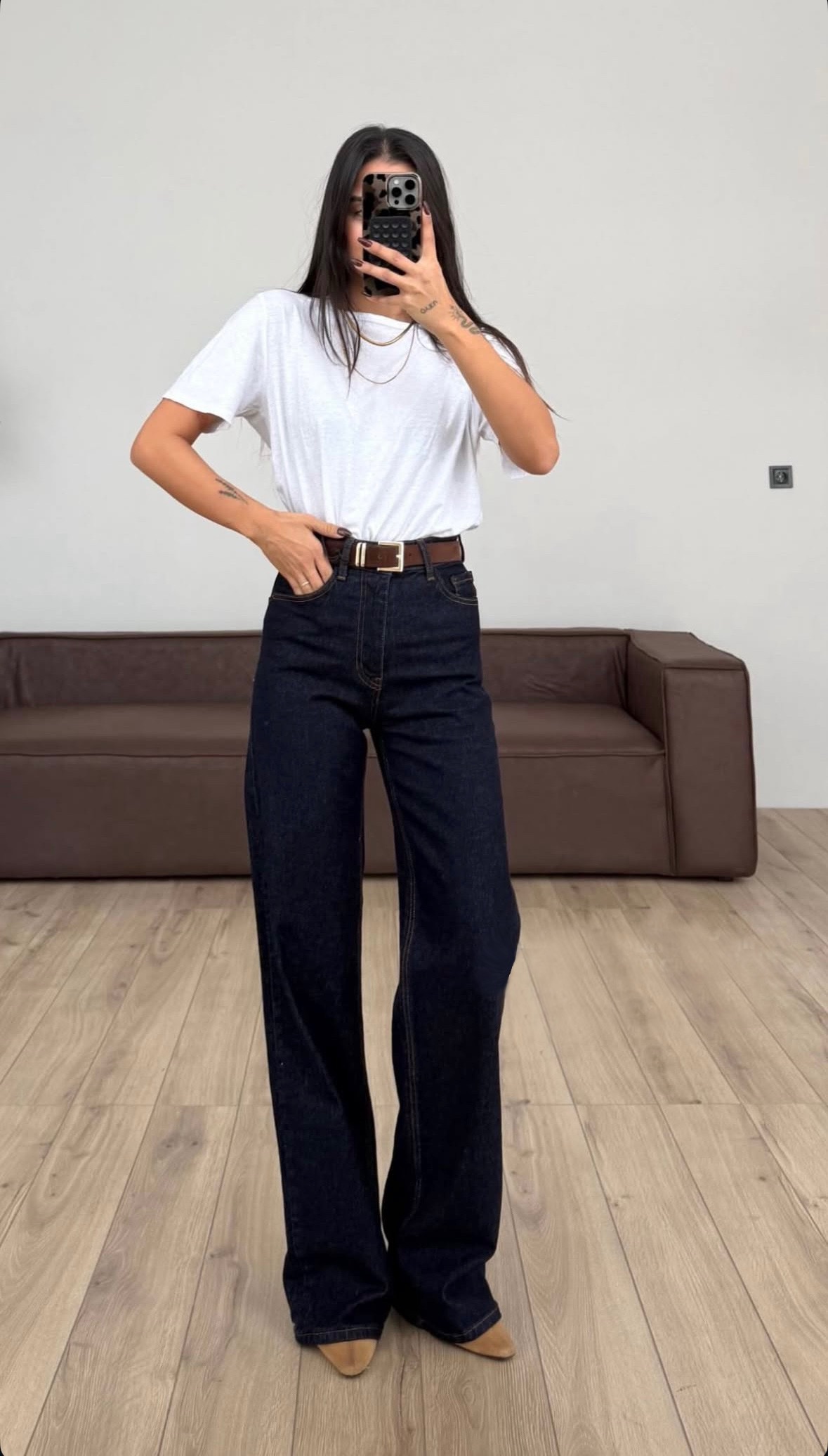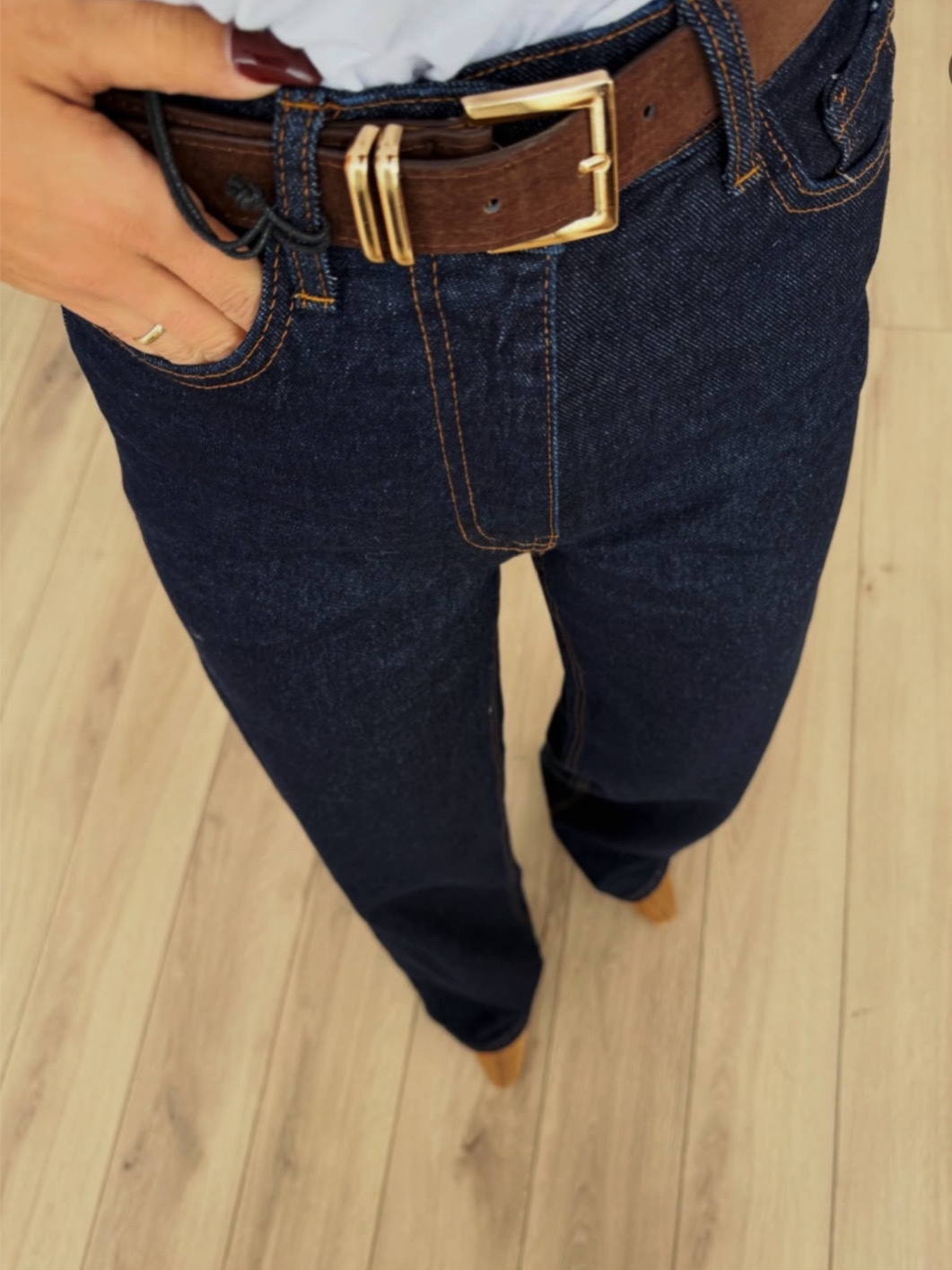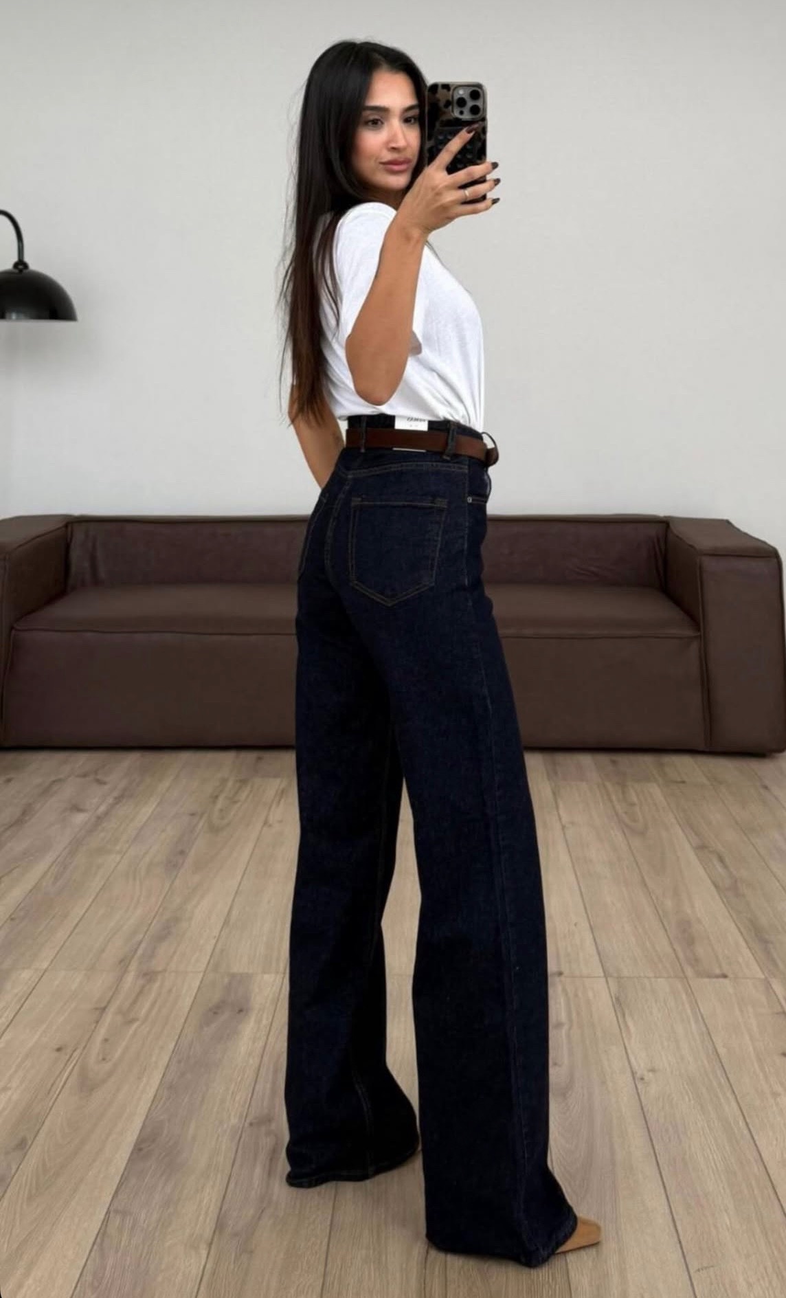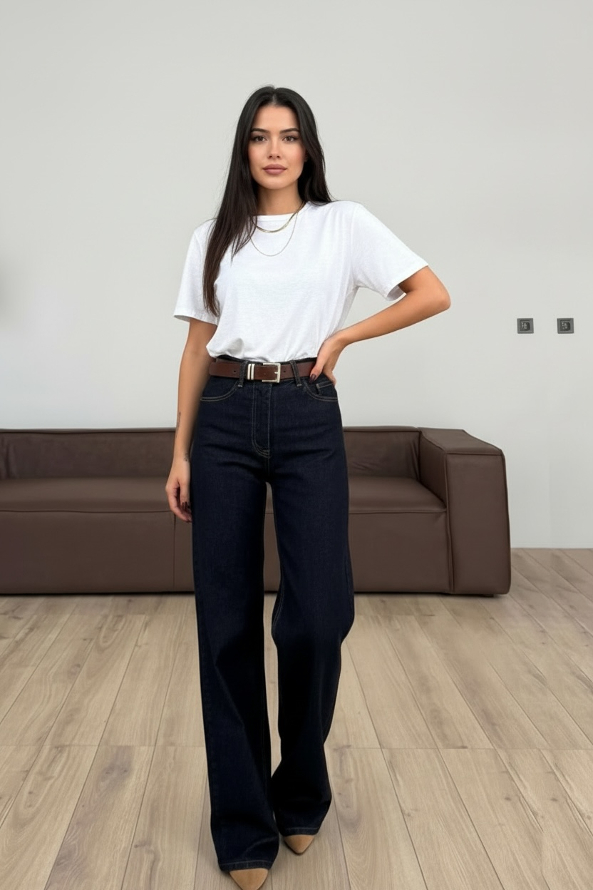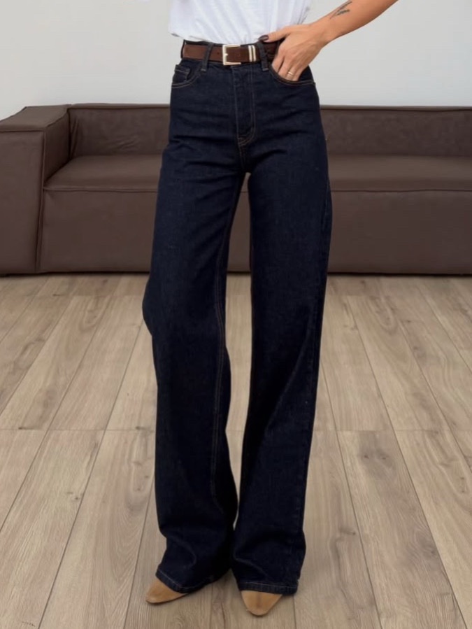 Тези дамски тъмносини дънки с висока талия са създадени за модерна, изчистена визия и максимален комфорт. Моделът е с права, широка кройка, която пада свободно по крака и издължава силуета, придавайки елегантно и уверено излъчване. Това е универсален дизайн, който съчетава съвременна мода с практичност за ежедневието.