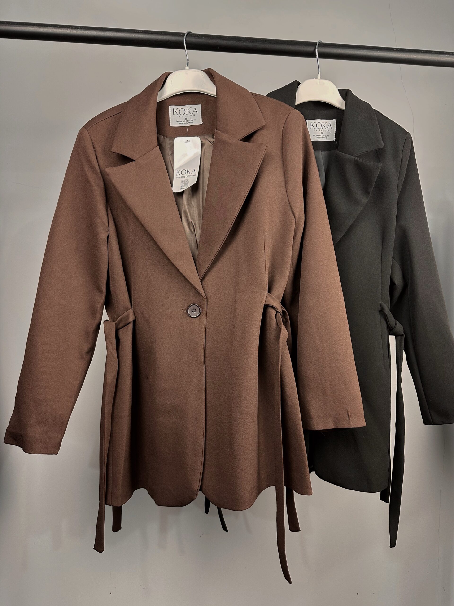 Елегантно дамско сако в наситен кафяв цвят — перфектната комбинация от стил, комфорт и модерна визия. Това дълго дамско сако е изработено с изчистена линия и класическа кройка, която подчертава силуета и придава изтънченост на всяка визия. Моделът разполага с ревери, копче за закопчаване и декоративни връзки в талията за по-женствено оформяне.