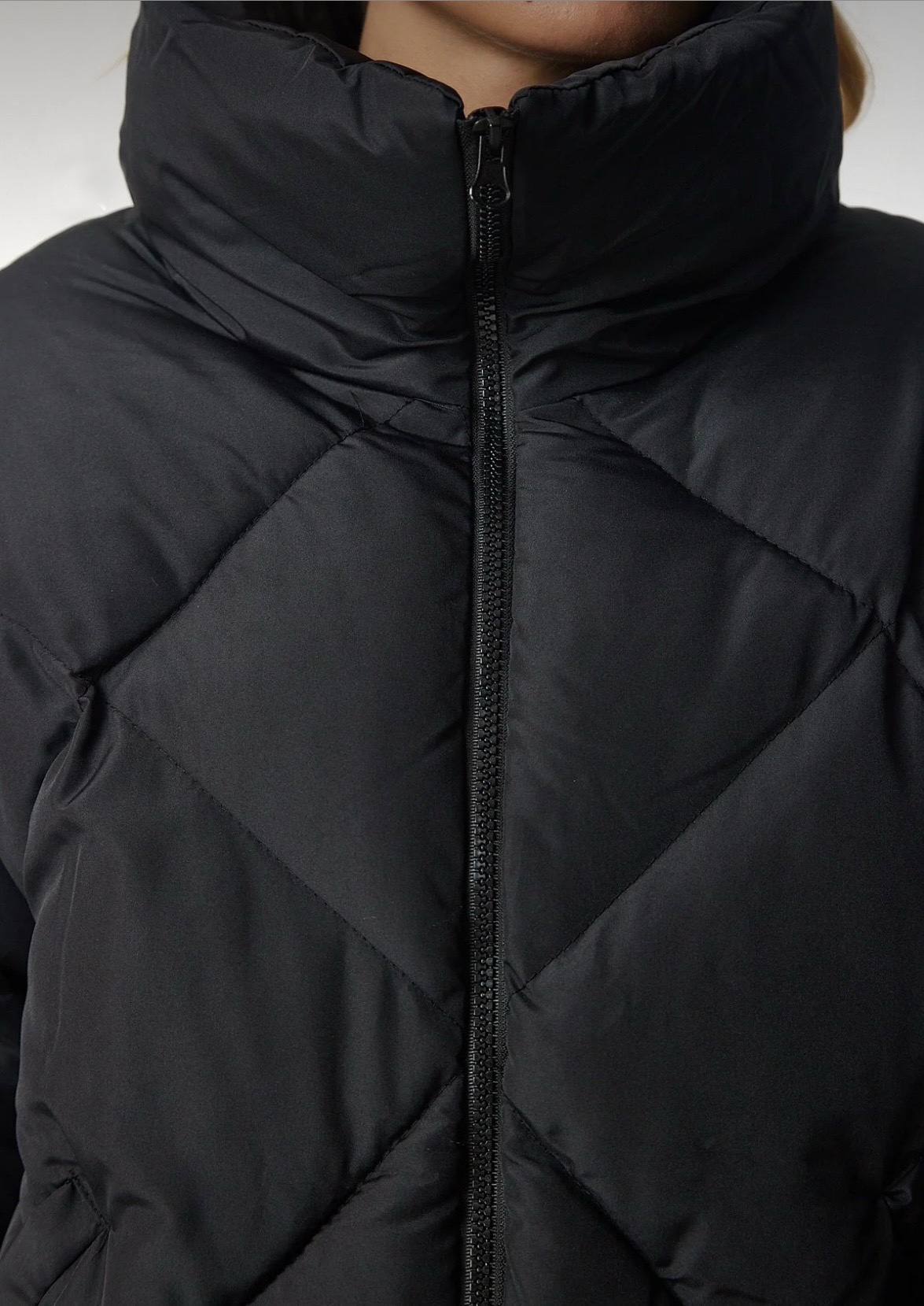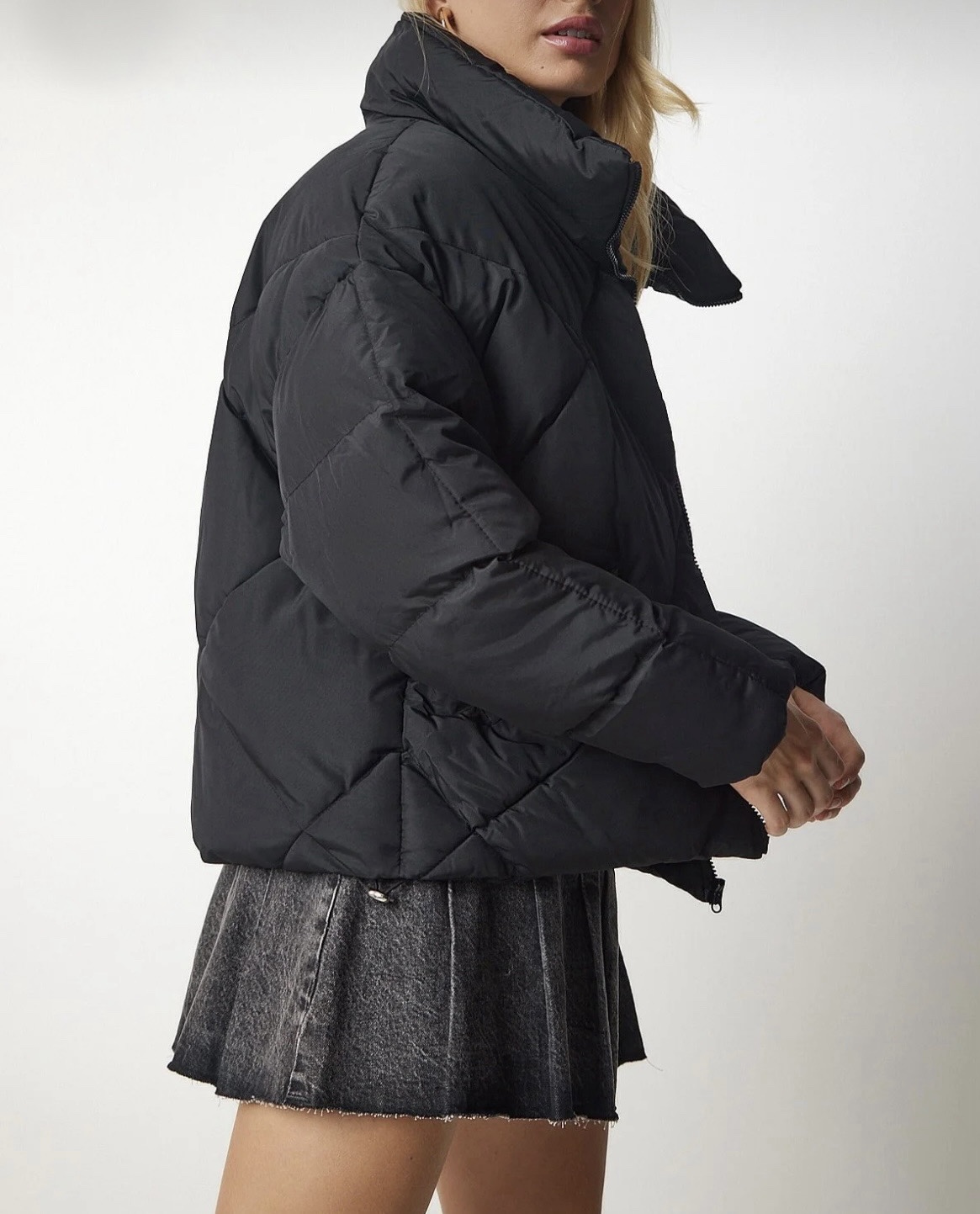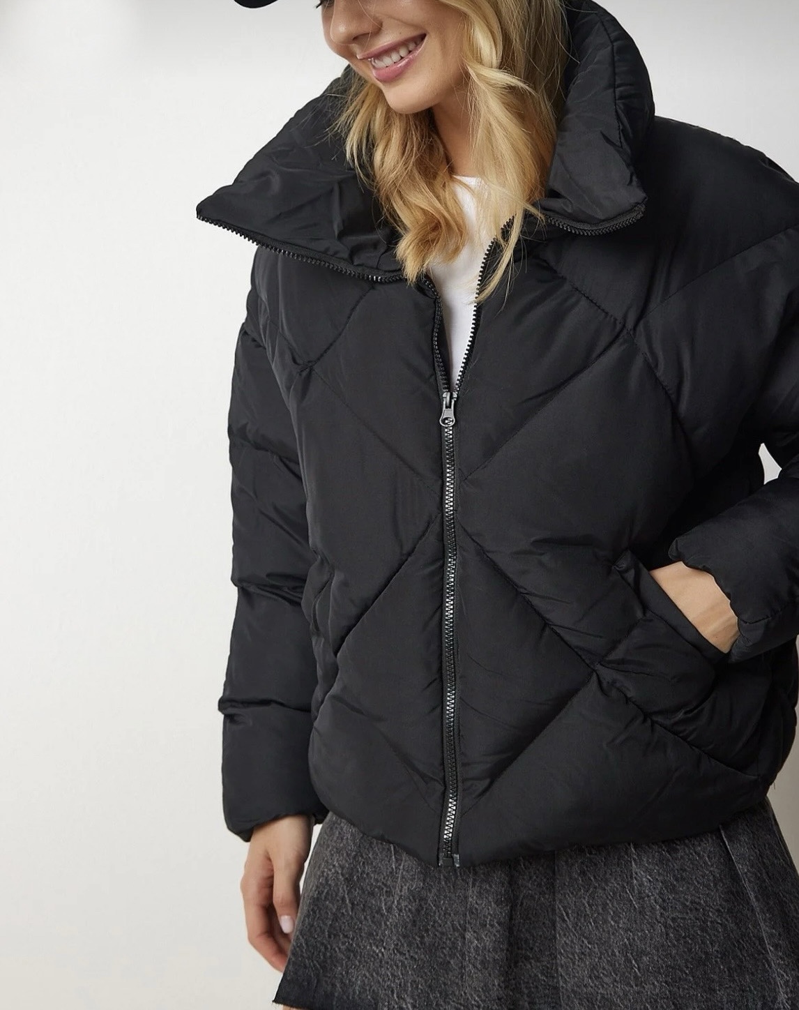 Това дамско късо черно подплатено яке е must-have модел за сезона – топло, модерно и изключително универсално. Дизайнът му впечатлява с диамантена капитонирана шарка.