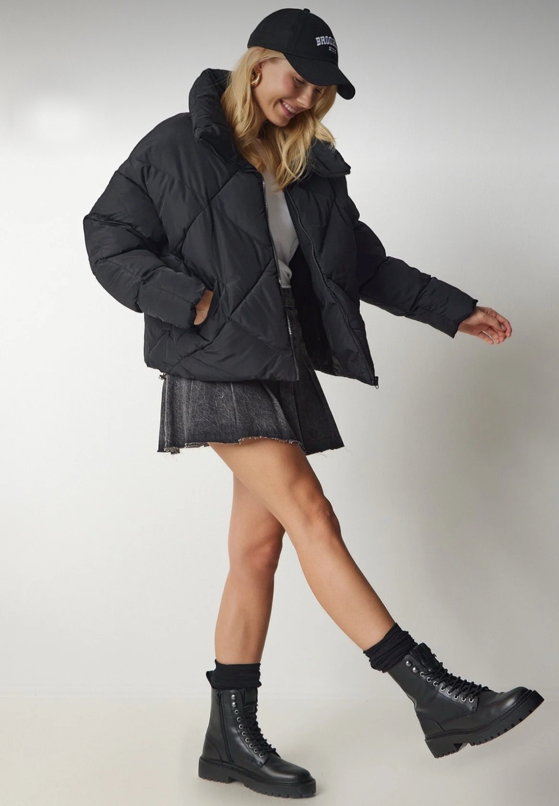 Моделът разполага с висока яка , която стои стилно и предпазва от вятър, както и с метален цип с декоративен ринг, добавящ акцент към цялостната визия. Свободният, леко оувърсайз силует позволява лесно комбиниране с пуловери, клинове, дънки и спортно-елегантни аутфити.