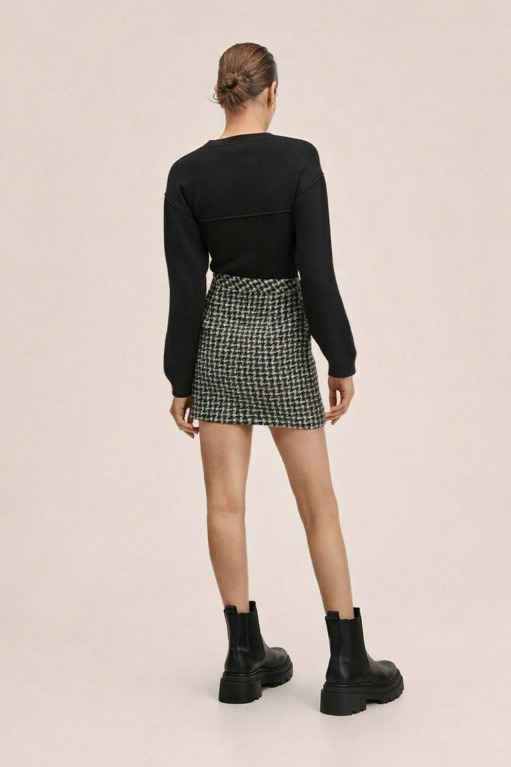Изработена от плътна, висококачествена материя с характерен десен (пепит/рибена кост) в неутрални тонове, тази пола се комбинира лесно както с ежедневни пуловери, така и с официални блузи. Високата талия подчертава силуета, а дискретните предни джобове придават практичност и лежерен завършек.