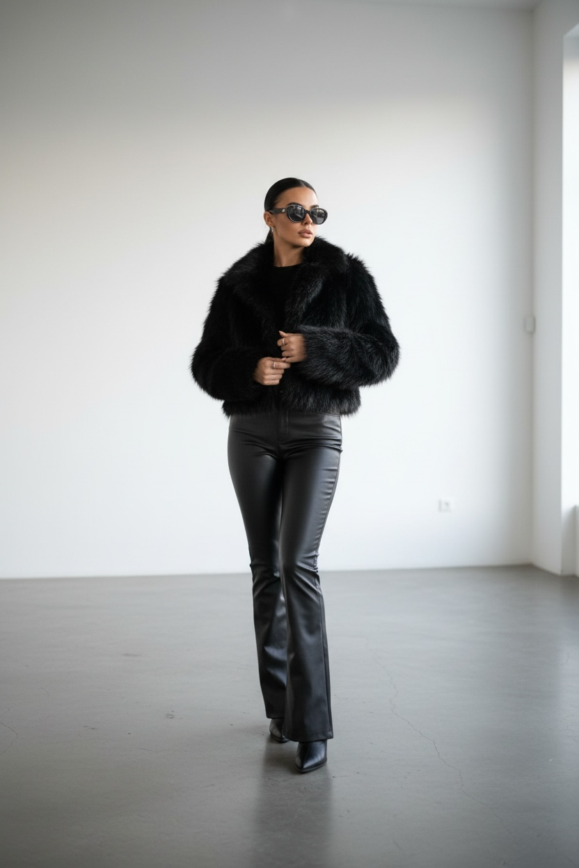 Късата кройка подчертава талията и създава ефектна пропорция , подходяща за градски , ежедневни и вечерни аутфити. Закопчаването с копче прави якето практично, а пухкавата текстура изключително модерна и луксозна . Моделът е перфектен за жени, които искат да изглеждат актуално, стилно и уверено.