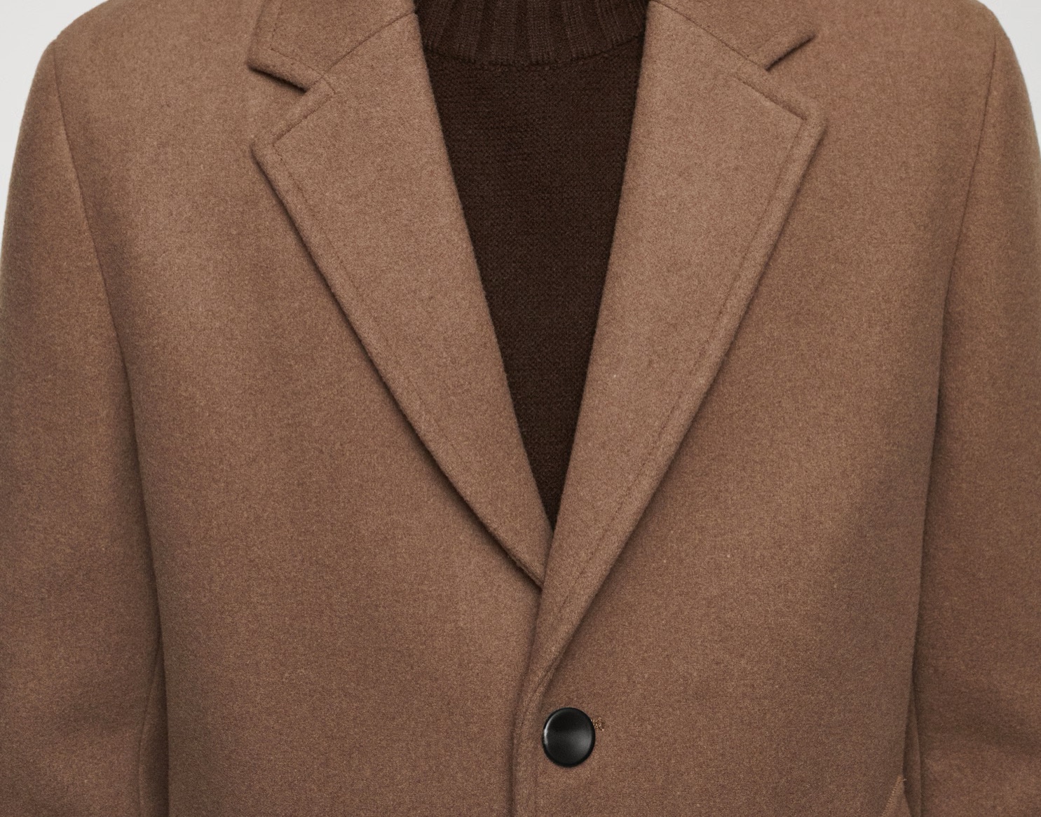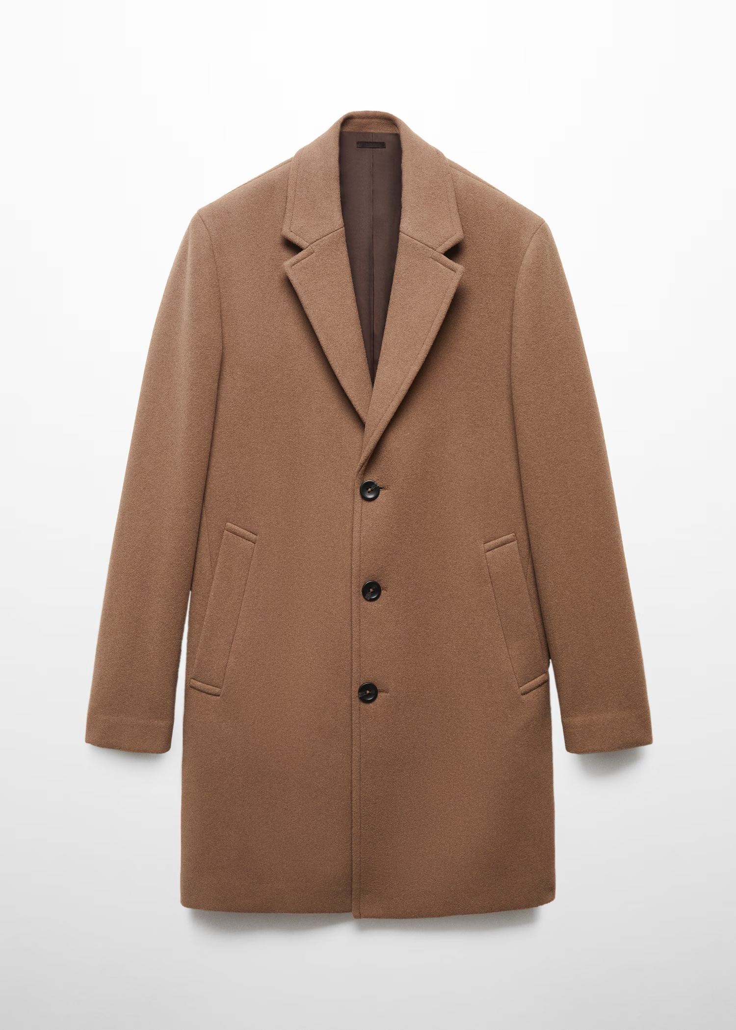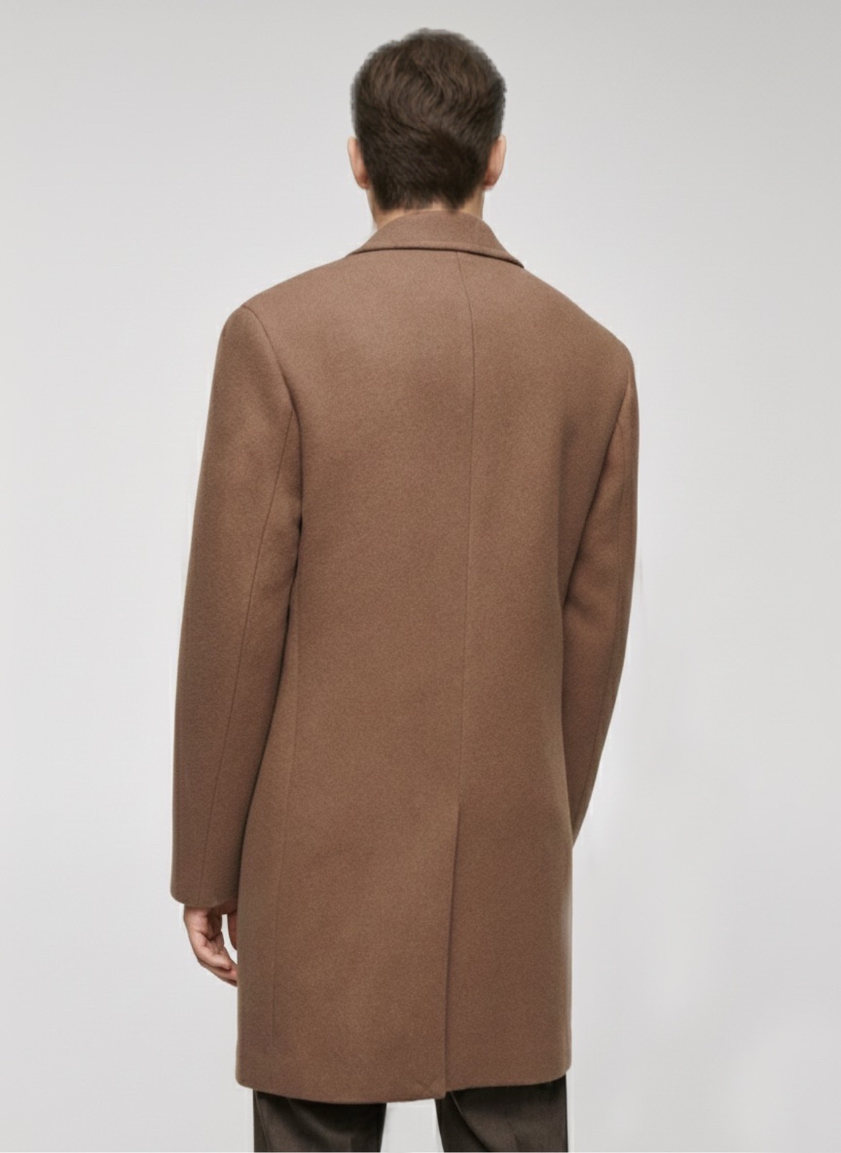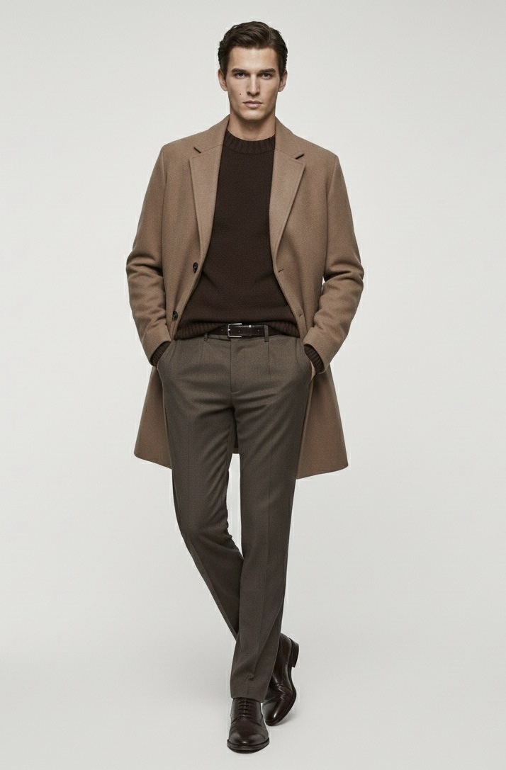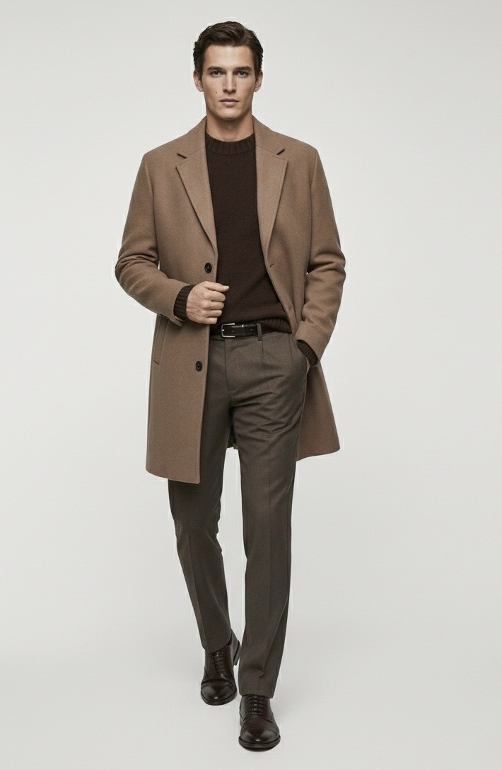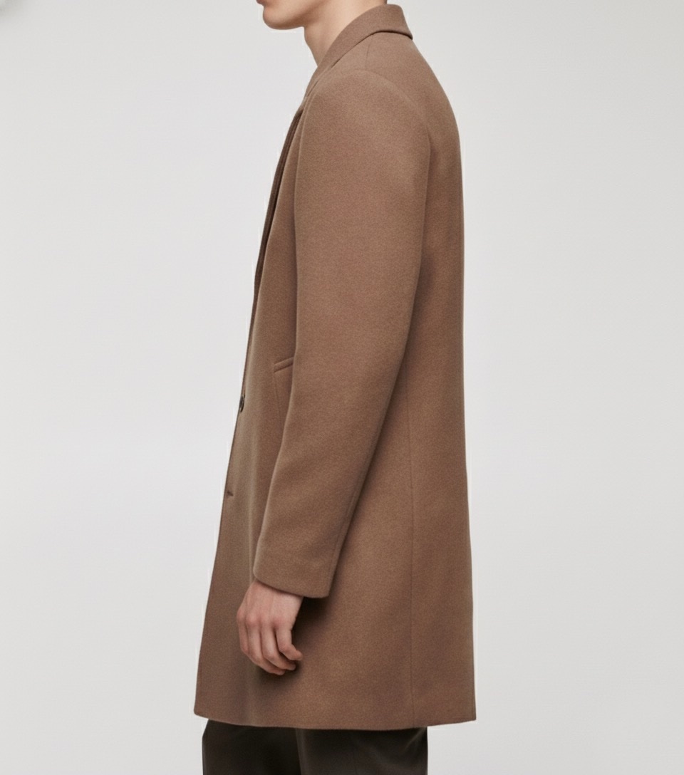 Това палто е перфектната инвестиция в класическия мъжки стил. Със своята изчистена кройка и дължина до коляното, то безпроблемно преминава от строго бизнес облекло до елегантна ежедневна визия. Неговият наситен цвят камел/средно кафяво е универсален и лесен за комбиниране с костюми, пуловери и деним.